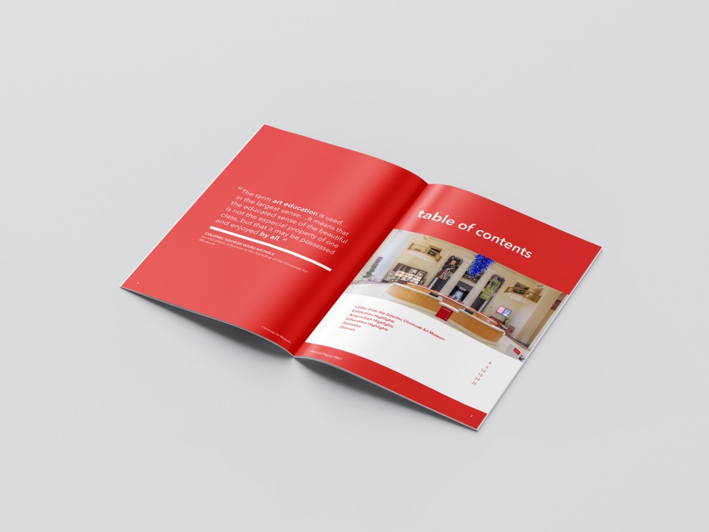 I was tasked with designing a mock annual report for the Cincinatti Art Museum for my Graphic Design III course. The report includes different kinds of information, such as text, graphs, and photographs, that I organized in a clean, easy to read way that reflected the visual brand of the museum. I created this booklet using Adobe InDesign and printed and assembled it myself. I learned a lot about organizing information and laying out a book rather than a single page. Making sure my craftsmanship was high quality when assembling the printed booklet was another important part of this assignment, and I learned a lot about printing through accomplishing this.