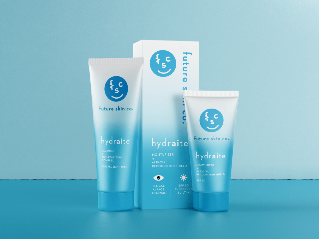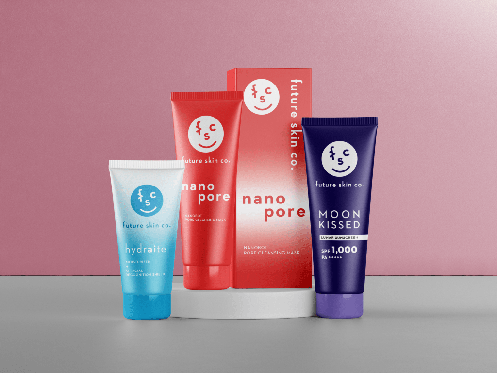 As part of a student project, I created packaging mockups for a fictional skincare brand, Future Skin Co. The project is based around the idea of speculative design, or design that addresses possible futures and how to design for these circumstances. This project responds to hypothetical future technologies and future environmental challenges in skincare. The collection includes three products: a face mask that uses nanobots to clean the user’s pores, a 1000 SPF sunscreen for leisure expeditions to the moon, and a moisturizer and cleanser that shield the user from unwanted AI facial recognition. As a graphic designer, this project allowed me to explore branding and packaging design while also expanding my mindset beyond visual design and into a new field of design I had never interacted with before. It was also an opportunity to create a more playful, tongue-in-cheek design that is less realistic and more imaginative.