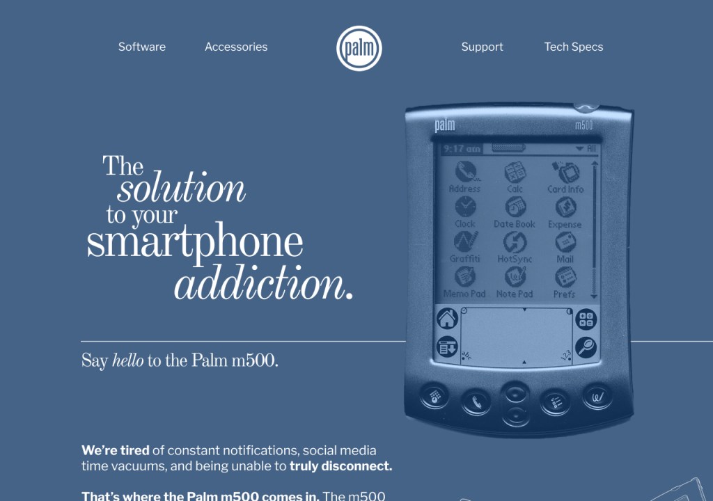 This project is part of a class assignment in which I was asked to reimagine a product or brand from the past and create a hypothetical landing page to help promote the product in today’s marketplace. I chose to rebrand the Palm m500 PDA as a secondary device that addresses phone addiction and the fatigue of always being connected, in the vein of the Light Phone and new Palm phone products. I used large, thin serif typography inspired by late 90’s and early 2000’s editorial design with blue tones reminiscent of duotone printing on a cardboard box. I used Figma and Adobe Photoshop to create this design.