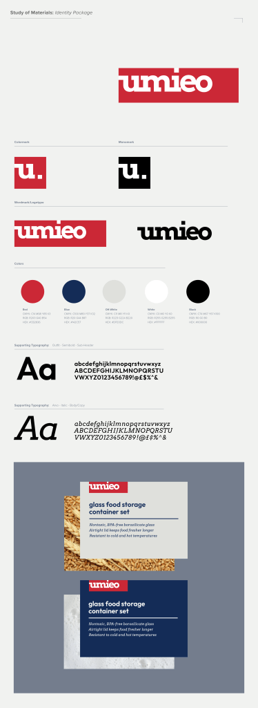 As part of an assignment for my Graphic Design IV: Systems Design course, I was tasked with rebranding a “no name” brand found on Amazon. I chose Umieo, which is a company that sells glass food containers and reusable cups. Umieo’s current logo does not represent anything about the products they sell or the market their products compete in. For this rebrand, I came up with a visual identity that fits in the food storage market (think Pyrex, Rubbermaid, and Elfa), but stands out with bold slab serif typography and clean, eye-catching layouts. As glass food storage is somewhat of a luxury, I wanted to keep the brand feeling premium without seeming impractical. To do this, I used darker shades of color with high saturation, and mature yet energetic typography treatments. I used Adobe Illustrator to create this project.