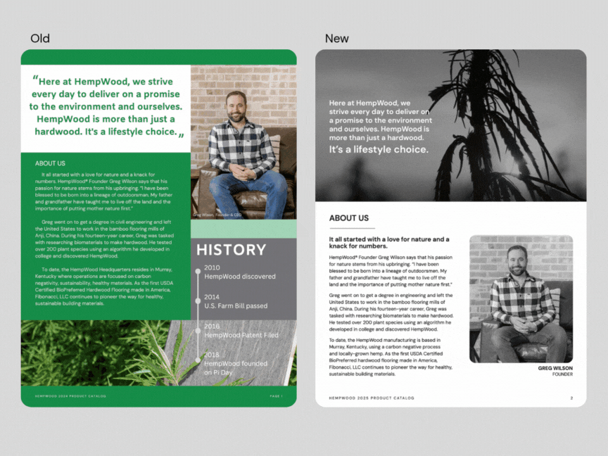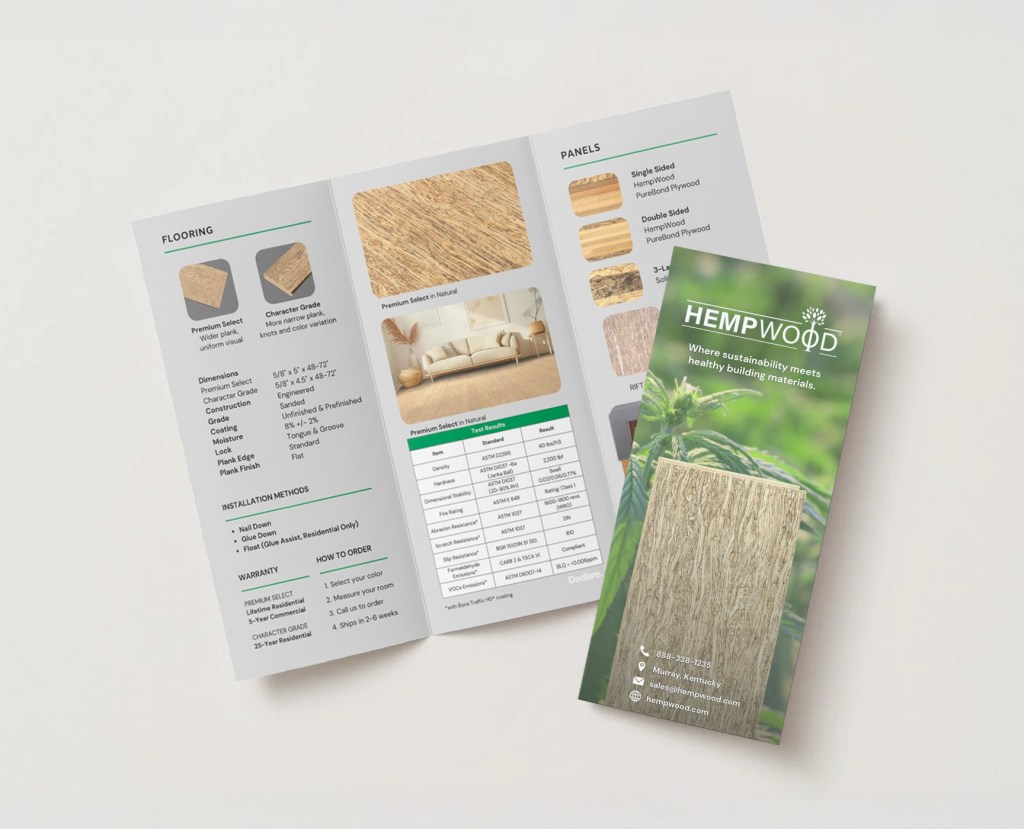 I applied the evolved visual identity to HempWood’s print materials (brochures and trade show banners), digital product catalogs, and slide decks.